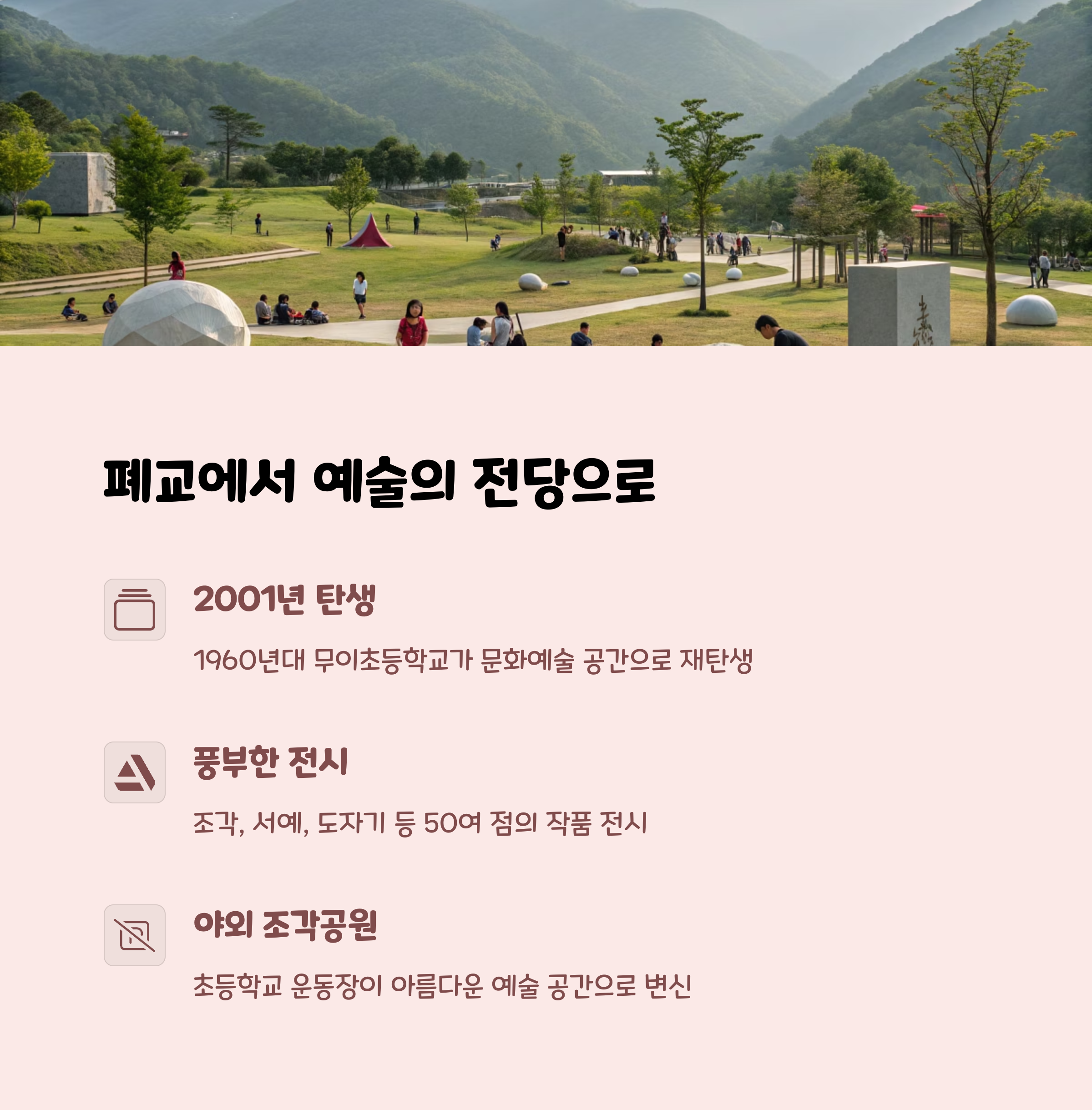 평창 무이예술관은 폐교된 초등학교를 예술 공간으로 탈바꿈시킨 독특한 장소입니다.