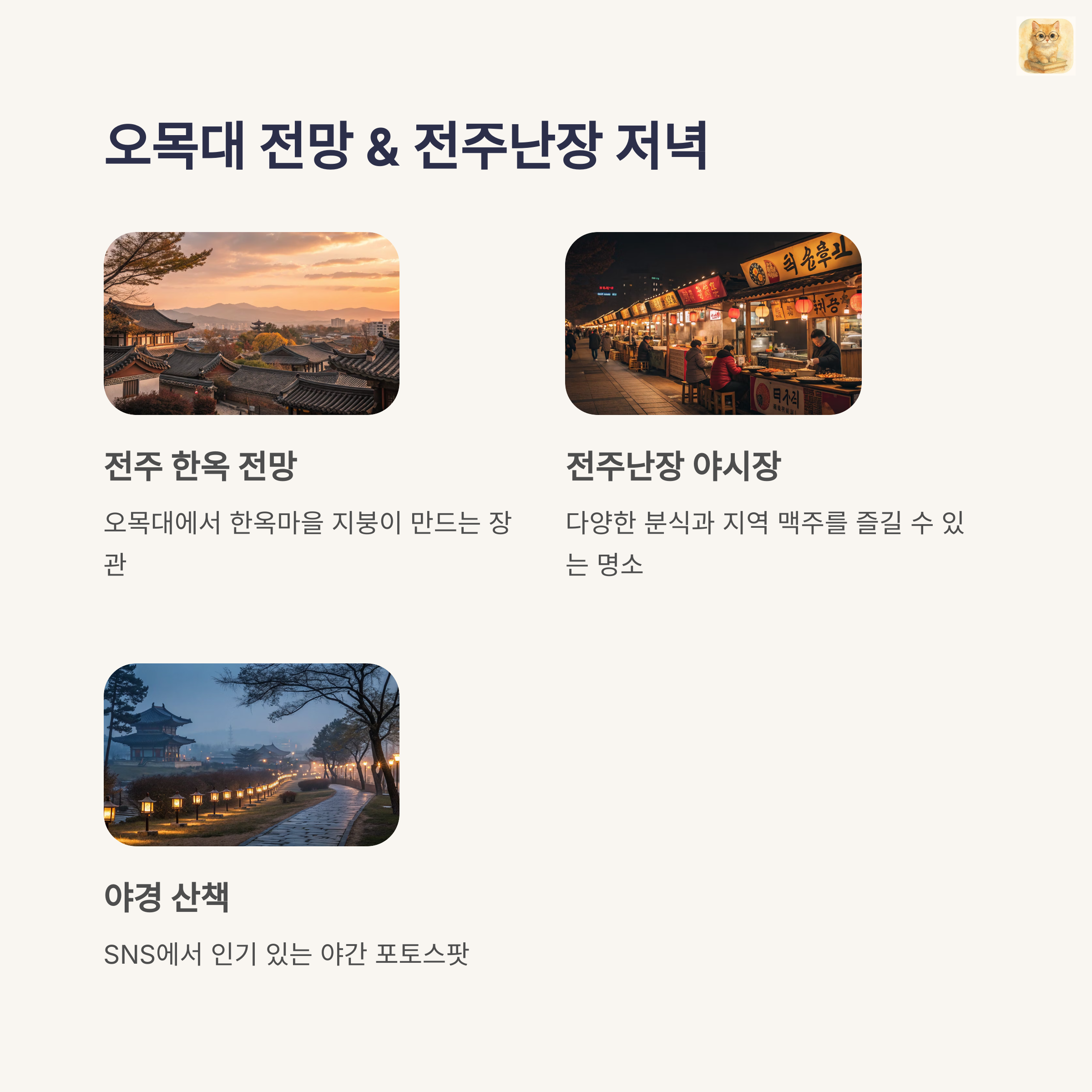 전주는 전통적인 멋과 현대적인 감각이 어우러진 도시로, 혼자 떠나도 전혀 외롭지 않은 여행을 즐길 수 있는 곳이에요.