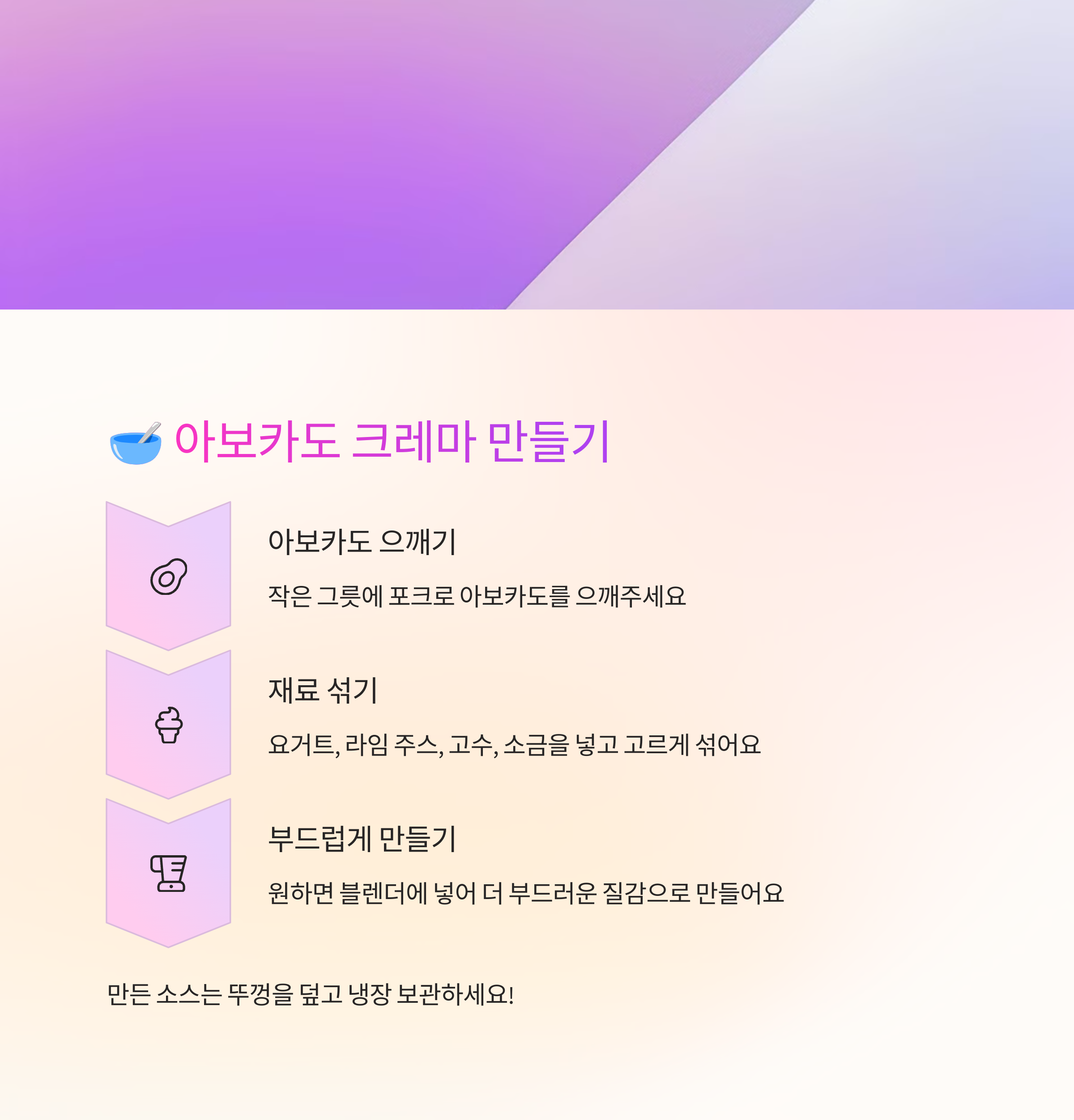 - 중간 크기 익은 아보카도 1개 (껍질 벗기고 으깬 것)