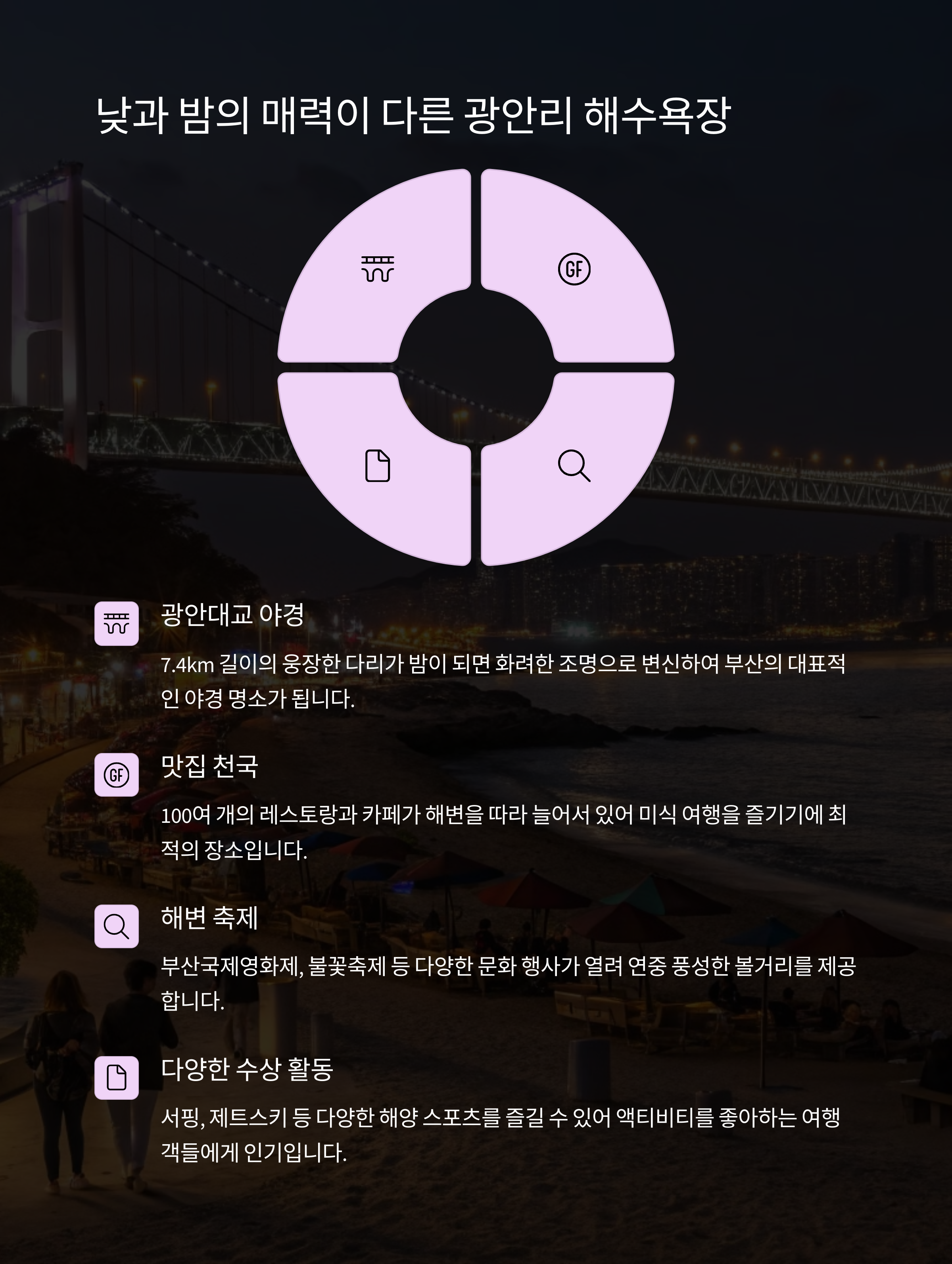 특히 광안대교가 빛나는 야경은 여행의 피로를 풀어줄 만큼 아름다워요!