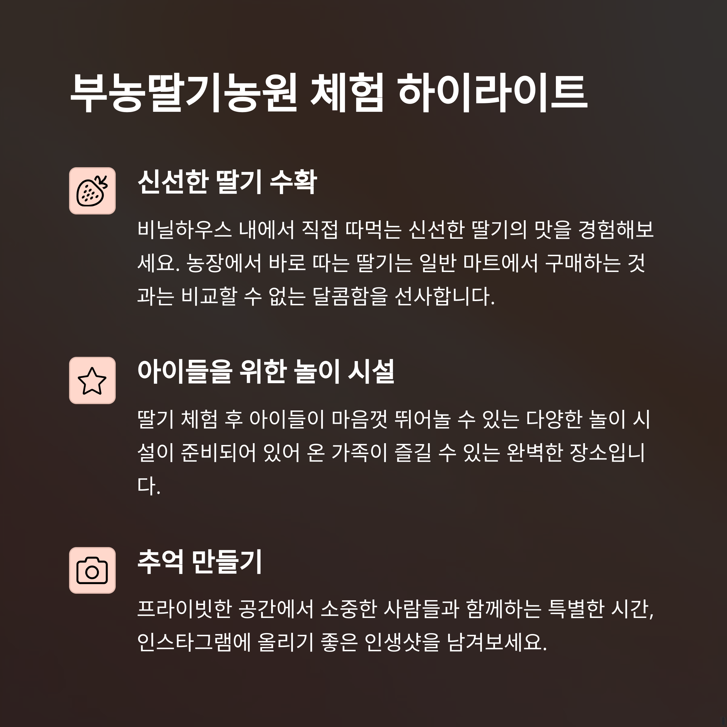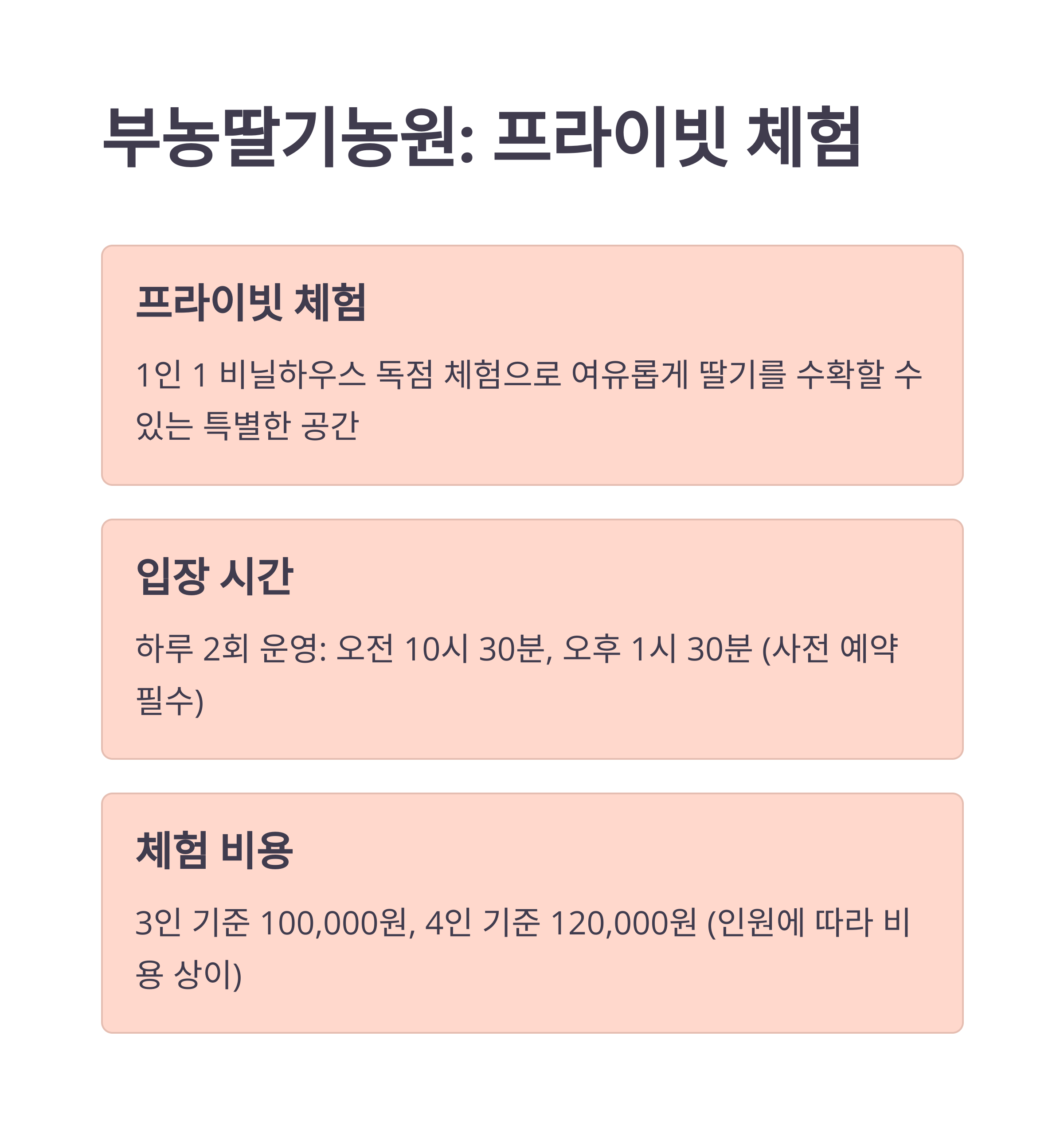 주요 특징 프라이빗 체험, 놀이 시설 딸기 및 동물 체험